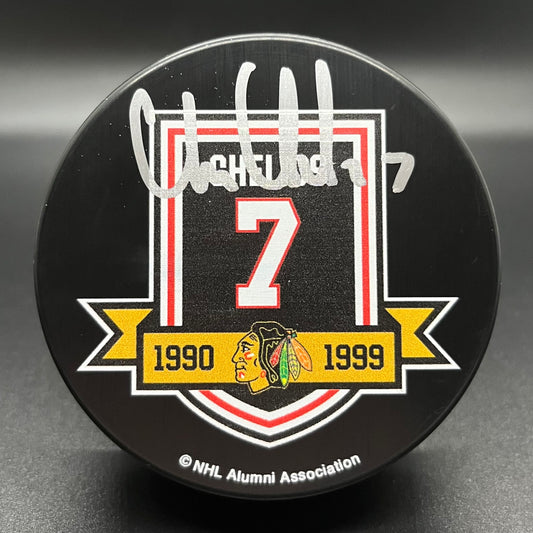Chris Chelios Jersey Retirement Autographed Puck (JSA)