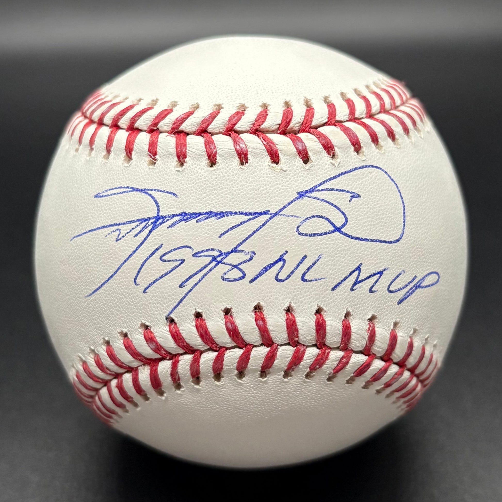 This official MLB baseball is signed and inscribed by Sammy Sosa, commemorating his 3x 60 home run seasons and 1998 NL MVP award. Known as one of the most prolific sluggers of his era, Sosa’s power at the plate made him a cornerstone of the Chicago Cubs and a global icon of the game. Signature comes with JSA authentication.